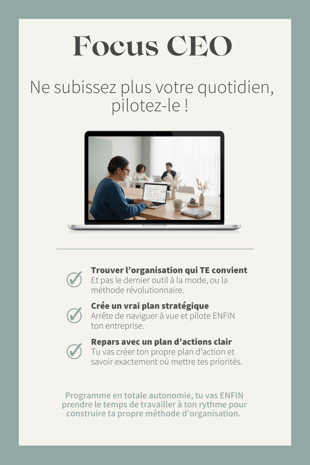 Avec FOCUS CEO, on oublie les méthodes usines à gaz qui rajoutent de la charge mentale. Ici, on simplifie au maximum. On revient à l'essentiel : TOI